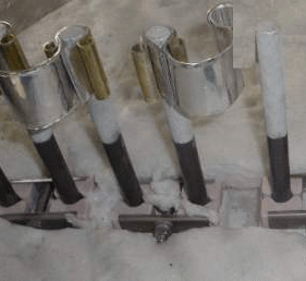 发热体的连接方法:连接带在冷端涂以金属铝的部位需安装铝箔带以便和电源连接。各类连接带都是由多层铝箔带折叠而成的。它借助于一个有螺丝的两块钢片紧固在电热元件的冷端,与母线相接的铝箔带部分则以专用铝轧头轧紧。机械应力不得经铝箔带传送到发热体上,故连接带长度必须比发热体端头与母线间的直线距离长。长度应留有25mm以上的余量。铝箔带应在紧固以前仔细加以调整,当将螺丝拧紧的发热体端头部位时,用力要自然,不得有弯曲的力,以免有外来应力影响发热体的自然状态。发热体的连接是先固定在母线上,然后逐个发热体互相连接。硅钼棒电热元件是在高电流强度下使用的,所以发热体和铝箔带之间必须保持良好的接触,连接两端的电压一般应小于0.01V,由于铝箔带在受热后会有松弛倾向,所以较好在电炉达到使用温度之后二、三小时,将所有的连接带螺丝重新拧紧。为了防止氧化,连接带不应在200℃以上的温度使用,因此,连续运转时的电流,Φ6的发热体应低于170A,Φ9的发热体应低于300A。